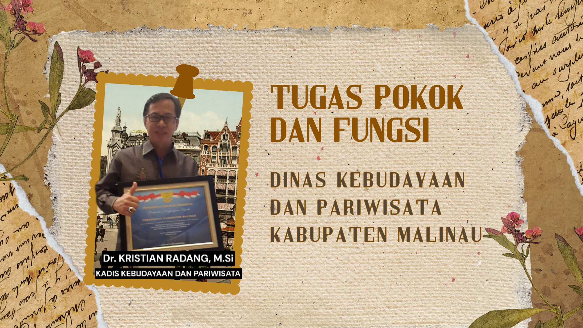 Dinas Kebudayaan dan Pariwisata mempunyai tugas pokok membantu bupati melaksanakan Urusan pemerintahan daerah di bidang Bidang Kesenian, Bidang Kebudayaan, Bidang Destinasi dan Usaha pariwisata, Bidang Pemasaran dan Kelembagaan Pariwisata yang menjadi kewenangan Daerah dan Tugas Pembantuan yang diberikan kepada Kabupaten.