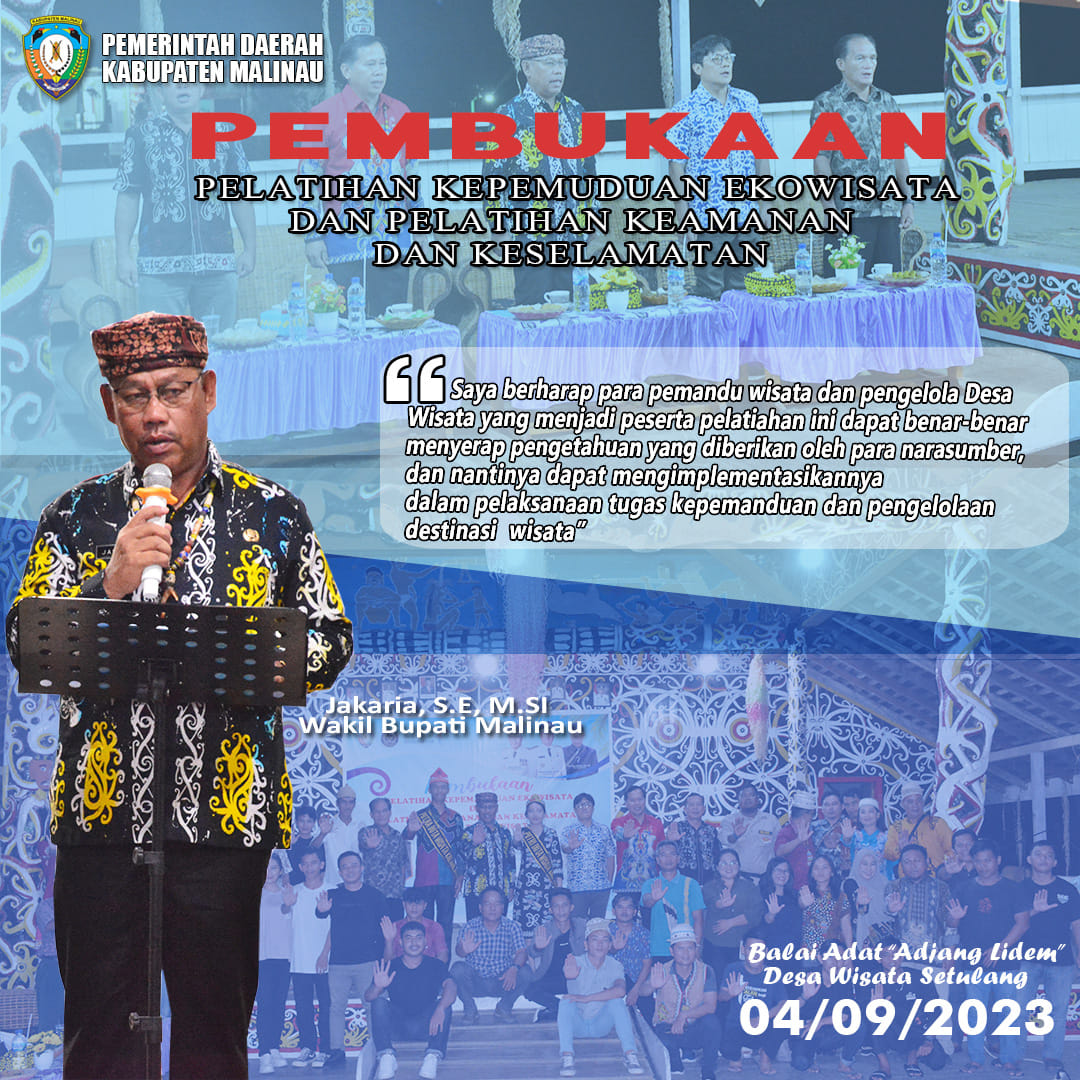 Malinau - Wakil Bupati Malinau Jakaria, SE.,M.Si menghadiri dan membuka Pelatihan Kepemanduan Ekowisata dan Pelatihan Keamanan dan Keselamatan di Daya Tarik Wisata pada tanggal 4 – 9 September 2023 di Desa Wisata Setulang, Kecematan Malinau Selatan Hilir. Senin (4/9/23) malam.